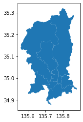0 MULTIPOLYGON (((135.31410 35.45566, 135.31255 ... 1 POLYGON ((135.72539 35.17080, 135.72552 35.170... 2 POLYGON ((135.75062 35.03822, 135.75079 35.038... 3 POLYGON ((135.80481 35.31708, 135.80586 35.316... 4 POLYGON ((135.73195 35.02251, 135.73195 35.022... Name: geometry, dtype: geometry
