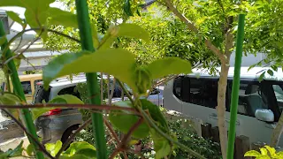 パッションフルーツの実が1個だけ成長中です。ブルーベリーは大部分の葉の先端が枯れているように見えます。何かの病気かなぁ?キウイはめちゃめちゃ成長中で、早くパーゴラを移設しないといけません。
